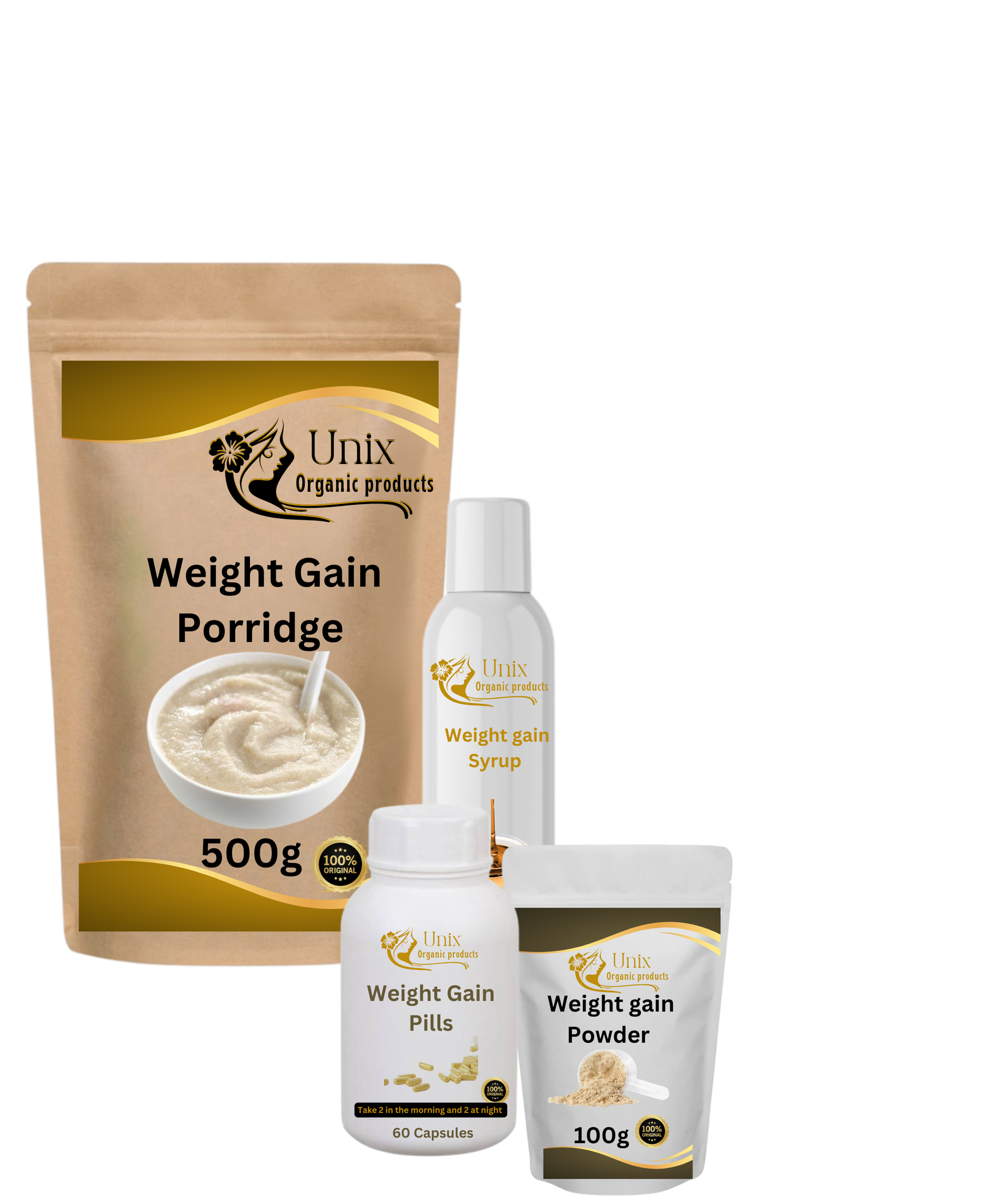 ✅Weight Gain Porridge (500g) – This porridge is made from natural ingredients to help you gain weight in a healthy way. Just prepare and enjoy it as a meal for easy and effective results. ✅Weight Gain Pills (60 Capsules) – These capsules support healthy weight gain by providing important nutrients to your body. Take them daily to help you reach your weight goals faster. ✅Weight Gain Syrup (125ml) – A natural syrup designed to help you gain weight easily. It works best when taken with a balanced diet for better results. ✅Weight Gain Powder (100g) – A smaller pack of our weight gain powder for easy use. Perfect for adding extra calories to your daily diet in a simple way.